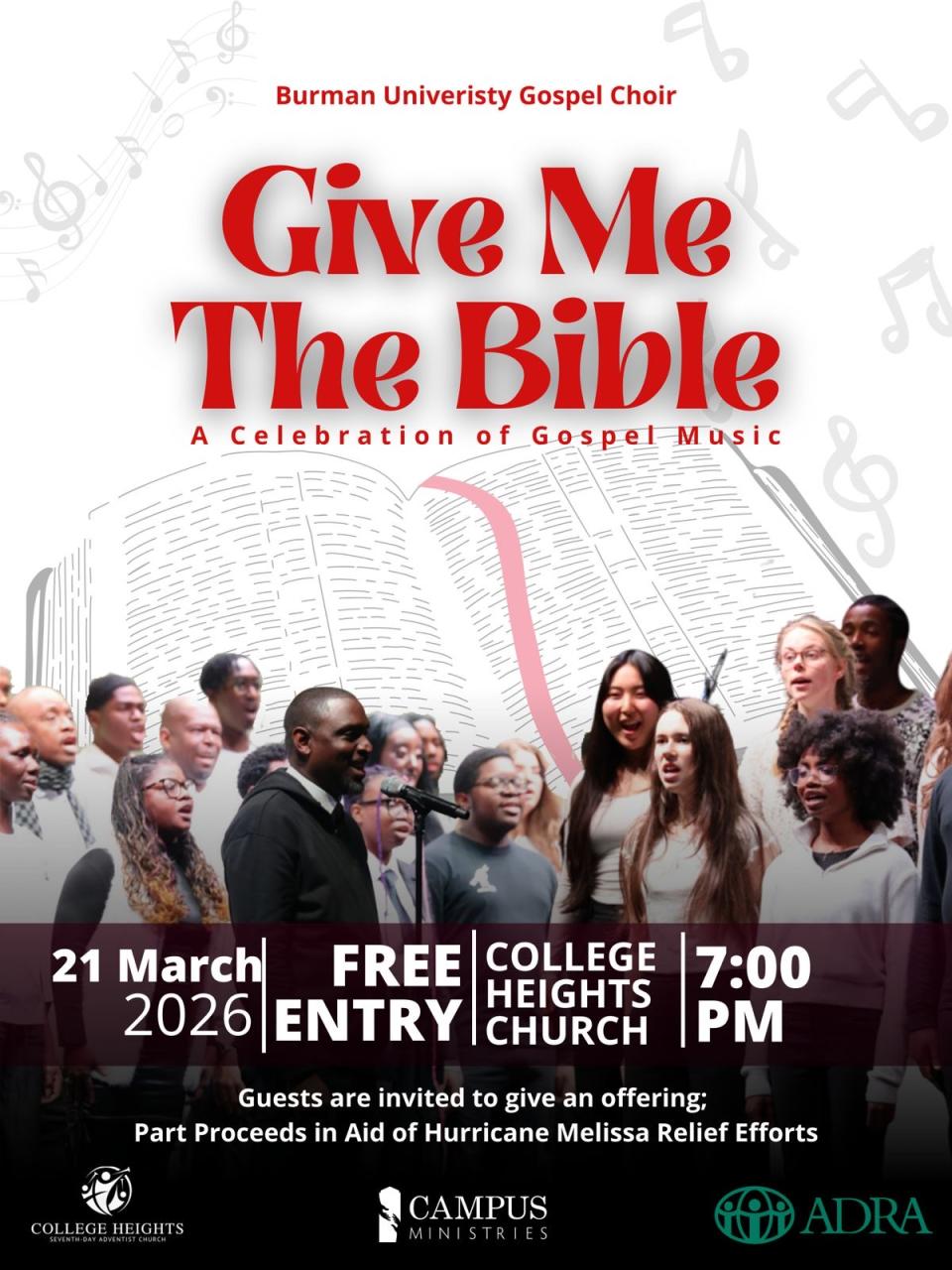 News & Events > Events > Gospel Choir Concert - Give Me The Bible Date March 21, 2026 Time 7:00 pm Location College Heights SDA Church Gospel Choir Concert - Give Me The Bible Event Livestream